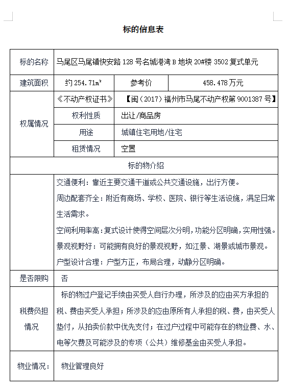 位于福建省福州市马尾区马尾镇快安路128号名城港湾B地块20#楼3501、3502复式单元(建筑面积约304.69㎡、254.71㎡,标的逐项拍卖)。