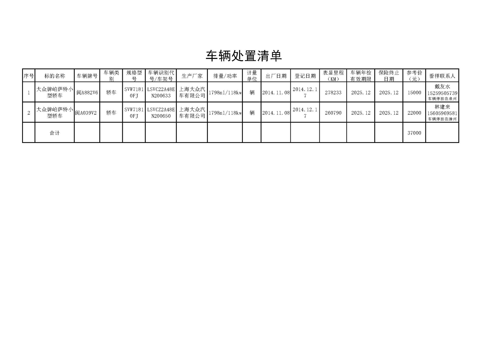 旧机动车两辆(大众牌岶萨特SVW71810FJ)。