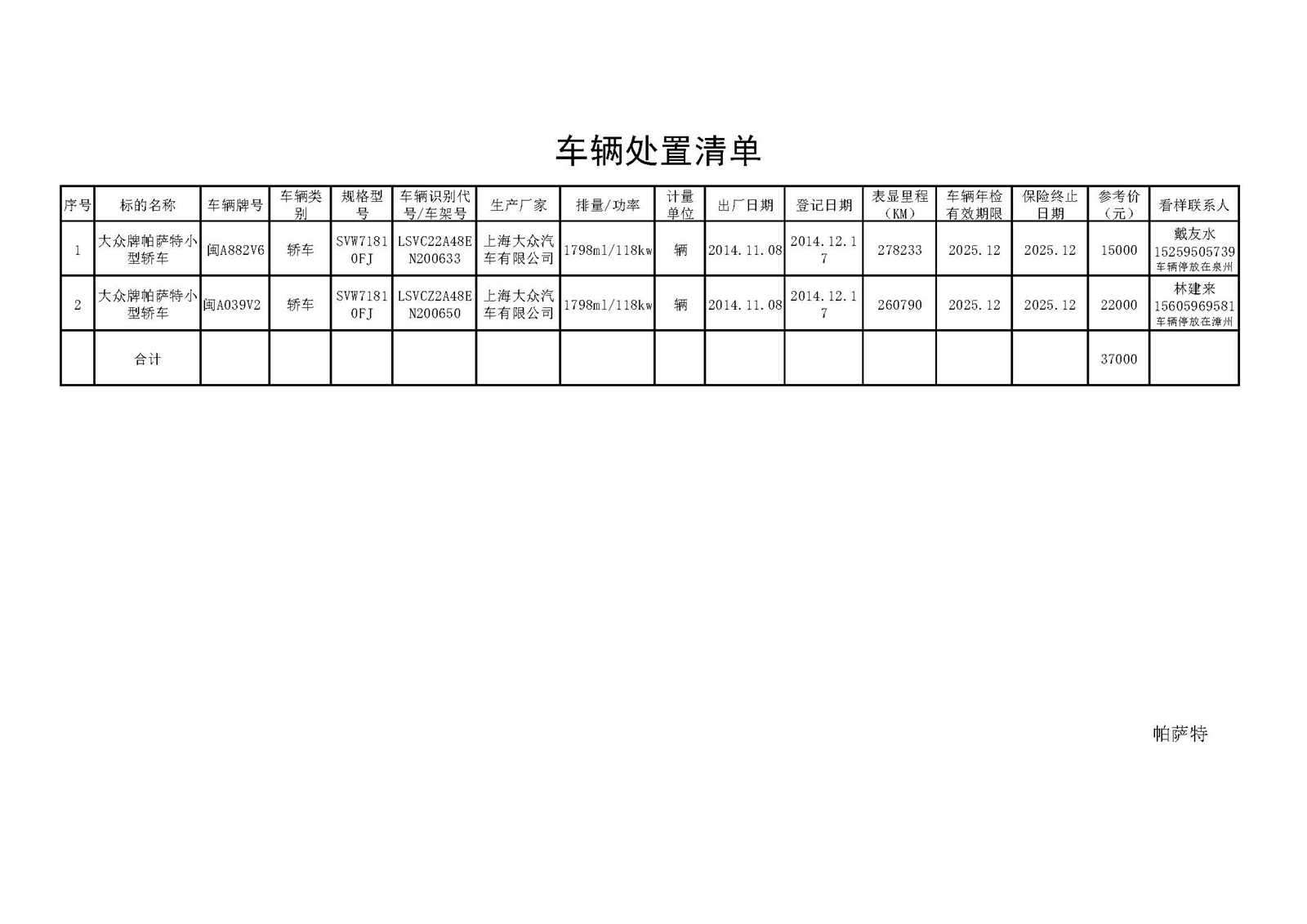 旧机动车两辆(大众牌帕萨特SVW71810FJ)。