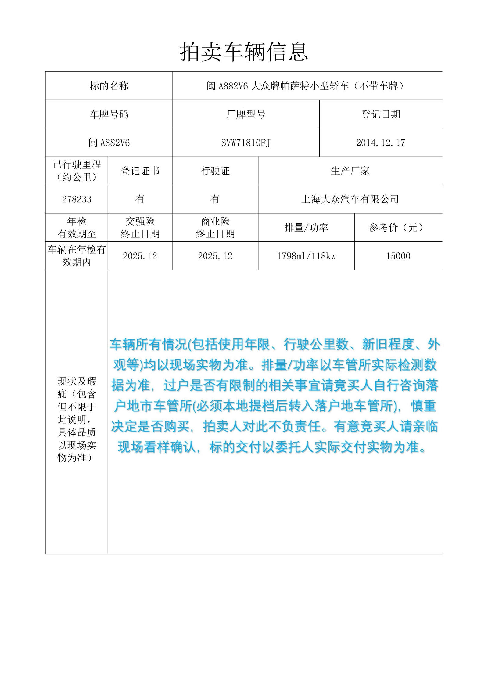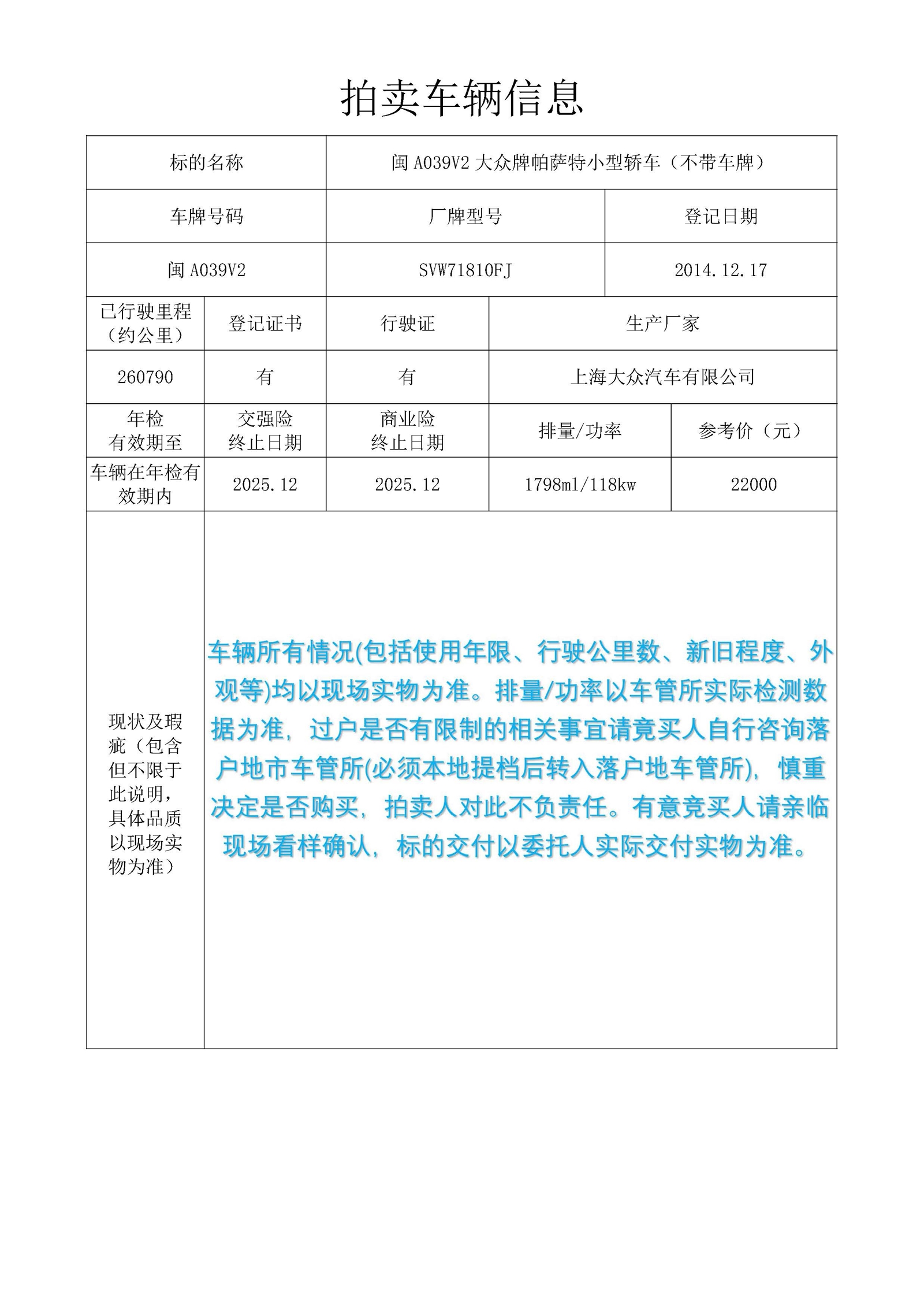 特别提示:拍卖标的仅以现状拍卖,委托人、拍卖人所作的关于上述拍卖标的的介绍(如数量、质量及使用性能、品牌、型号、参数等)及有关材料仅供竞买人参考,委托人、拍卖人不承担瑕疵担保责任。