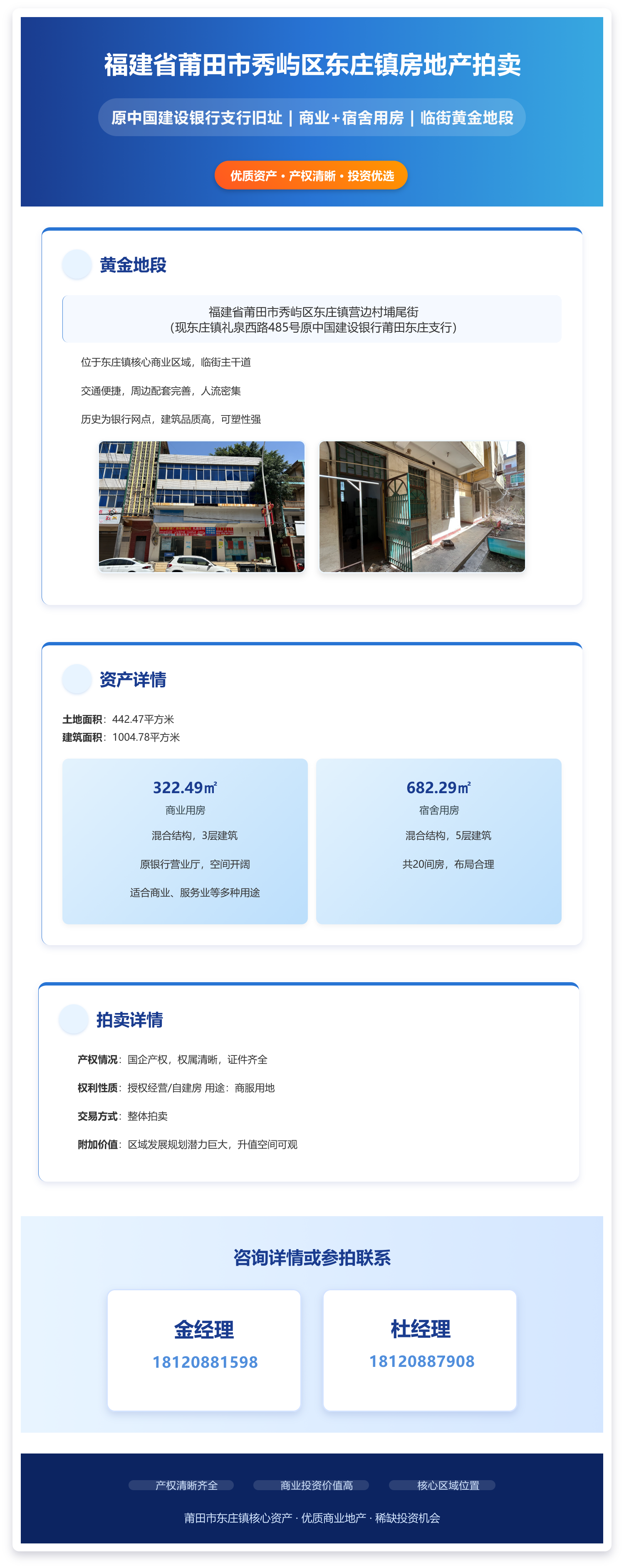 福建省莆田市秀屿区东庄镇营边村埔尾街房地产,建筑面积约1004.78平方米。(现东庄镇礼泉西路485号原中国建设银行莆田东庄支行)