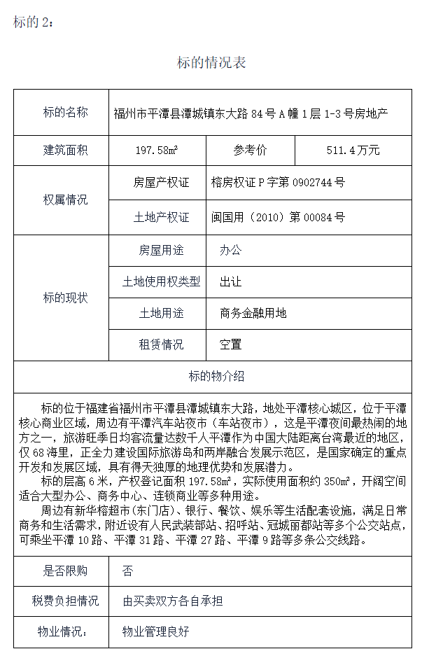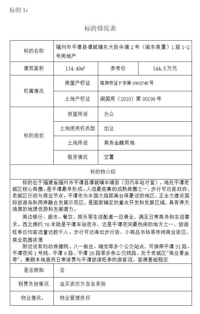 1、福州市平潭县潭城镇东大街中埔2号(闽东商厦)1层1-2号房地产(建筑面积约114.49㎡)。